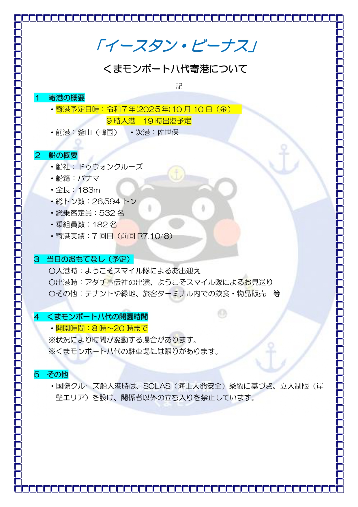2025年10月8日 / 最終更新日時 : 2025年10月10日 kpy_admin イベント情報 イースタン・ビーナス寄港情報 R7.10/10寄港予定 【入港時間の変更】 ●入港時間 9時 → 10時30分 FacebookXBlueskyCopy