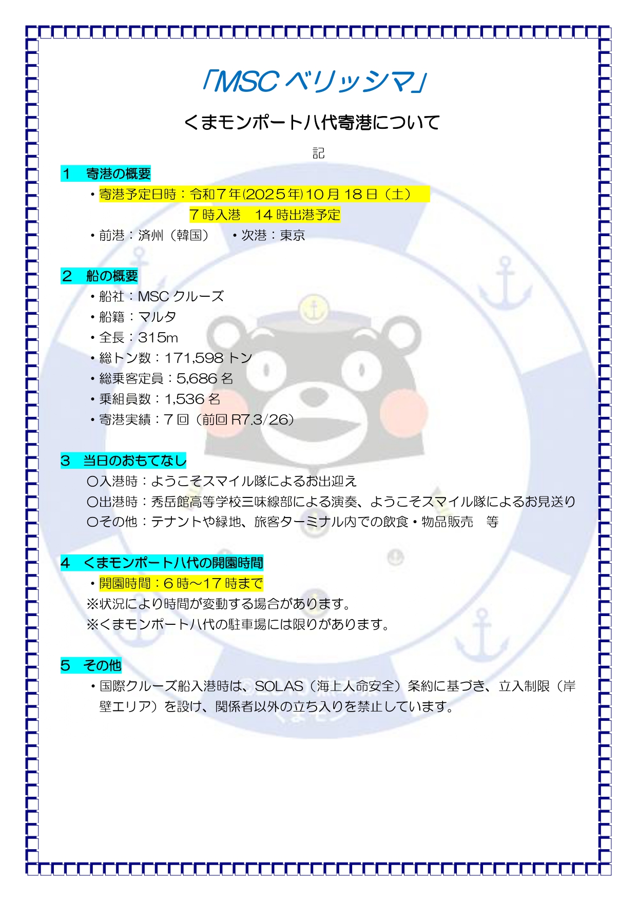 MSCベリッシマ寄港情報 R7.10/18寄港予定