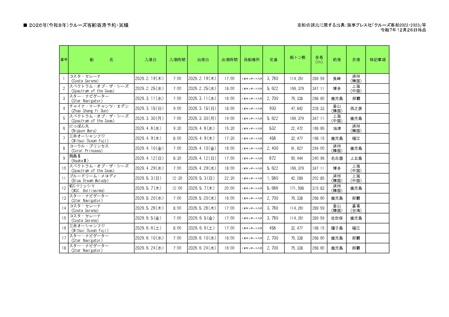 2026年(令和8年)クルーズ客船寄港予定(1月~6月)